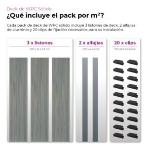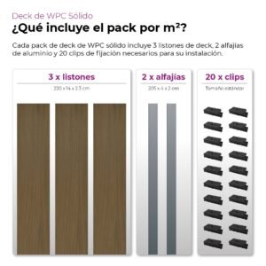 EL PACK INCLUYE 3 Listones de deck + 2 Alfajías de aluminio (4x2x205cm) + 20 Clips de fijación