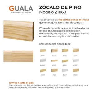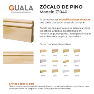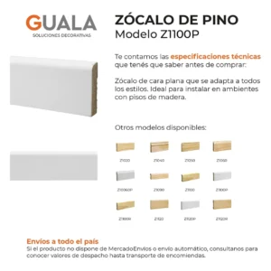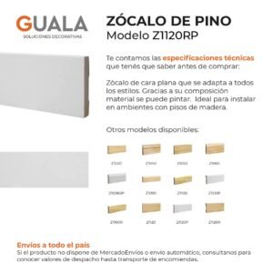 Zócalo de pino prepintado, de diseño tradicional y perfil curvo. Otorga una visual continúa a la unión del piso con la pared.