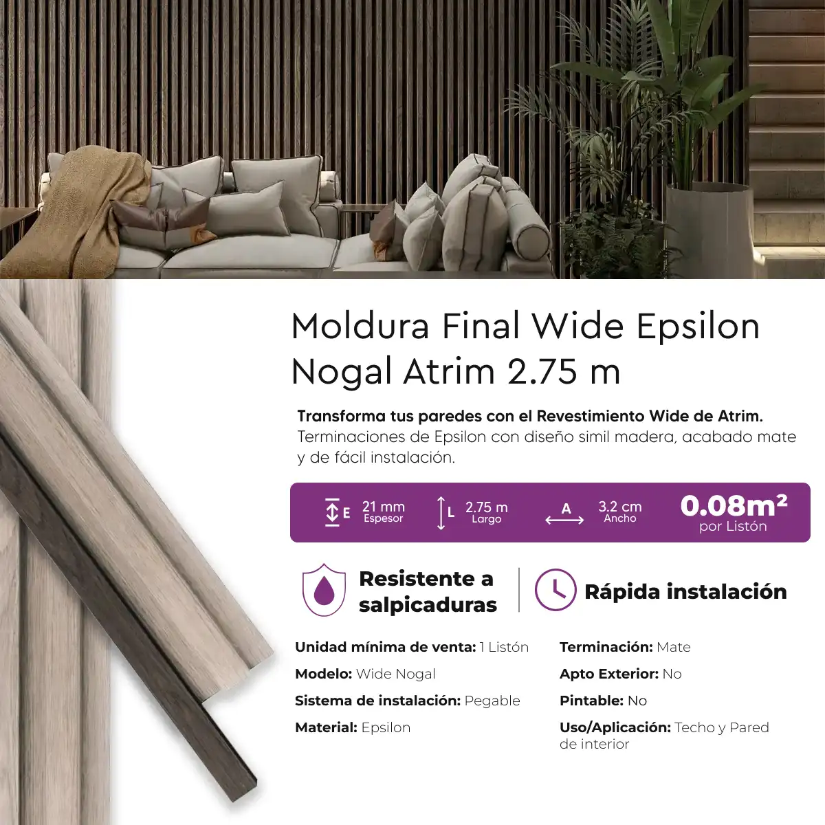 Terminación Final Revestimiento Wall Panel Atrim Wide Nogal EPS Simil Madera 2.75 m