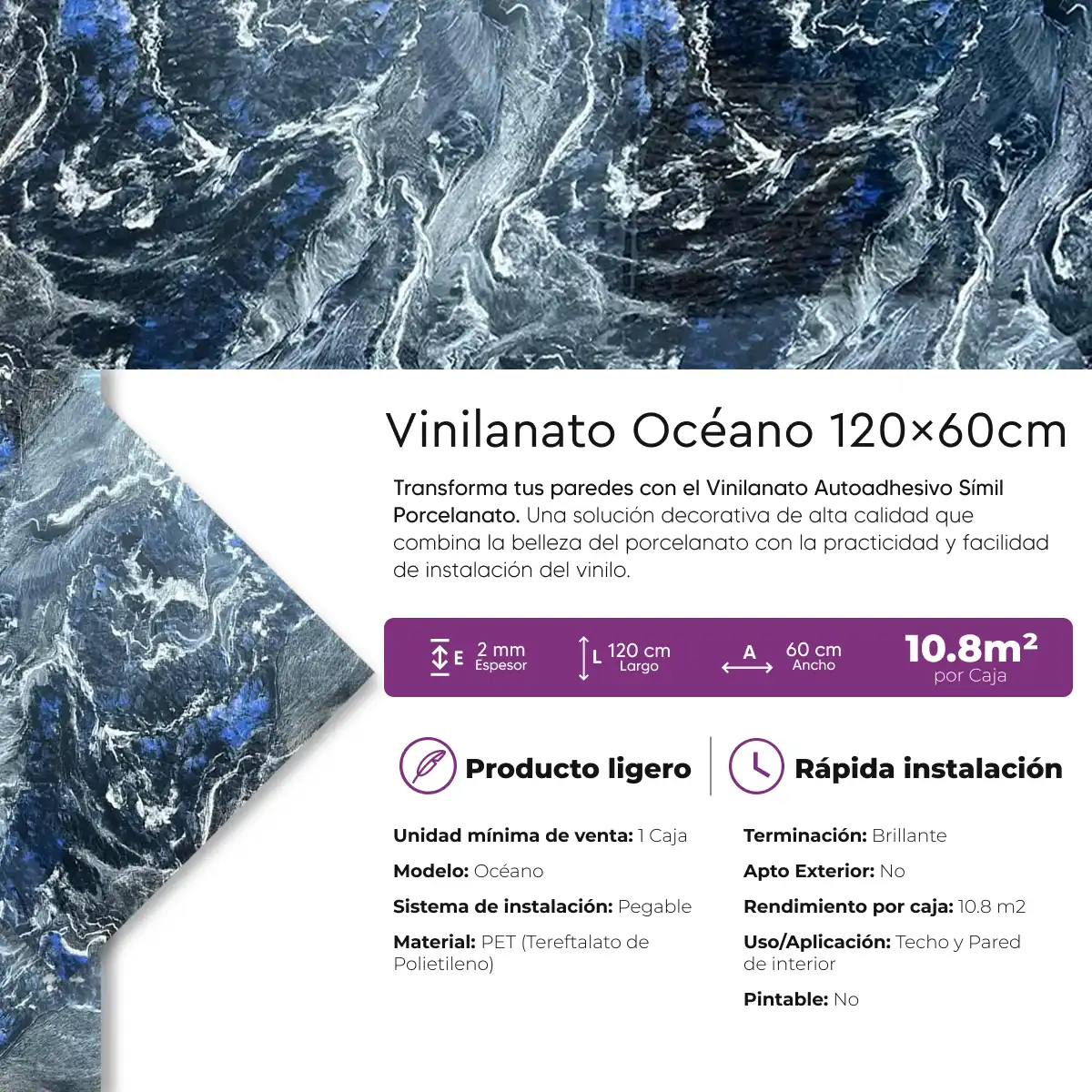 Caja Vinilanato Decorativo Autoadhesivo 60×120 Mármol Océano 10.8 m²