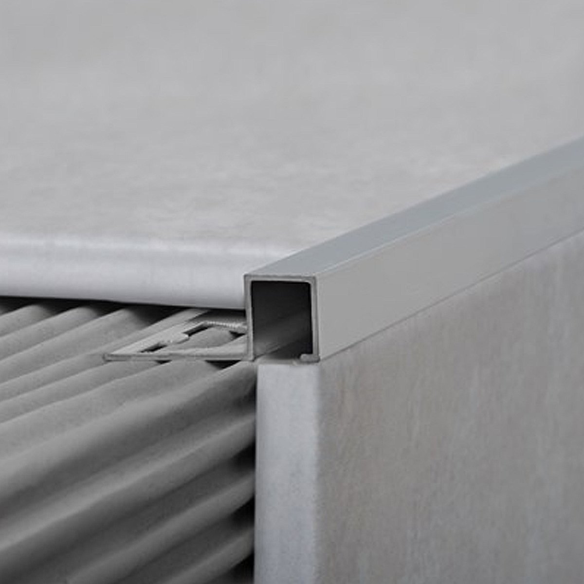 Perfil de vista cuadrada que acompaña griferías y diseños rectos. Protege la unión de los revestimientos logrando un diseño moderno. Se utiliza en porcelanatos rectificados o como listello decorativo.