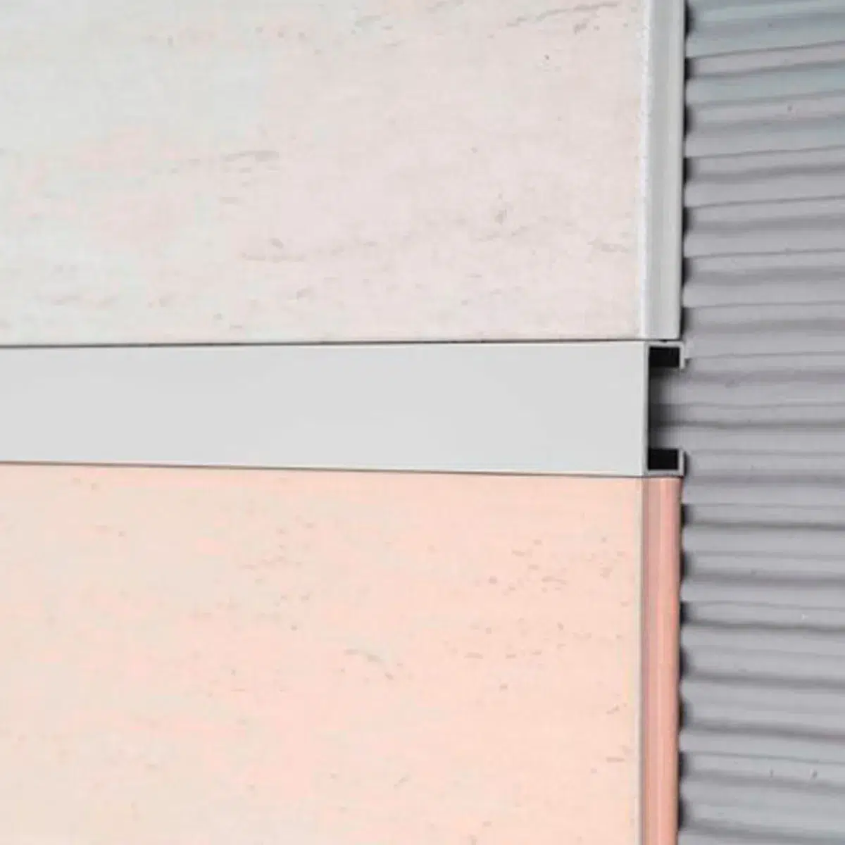 Perfil de 20 mm de vista, de líneas rectas. Puede utilizarse como guarda metálica o acompañando mallas cerámicas.