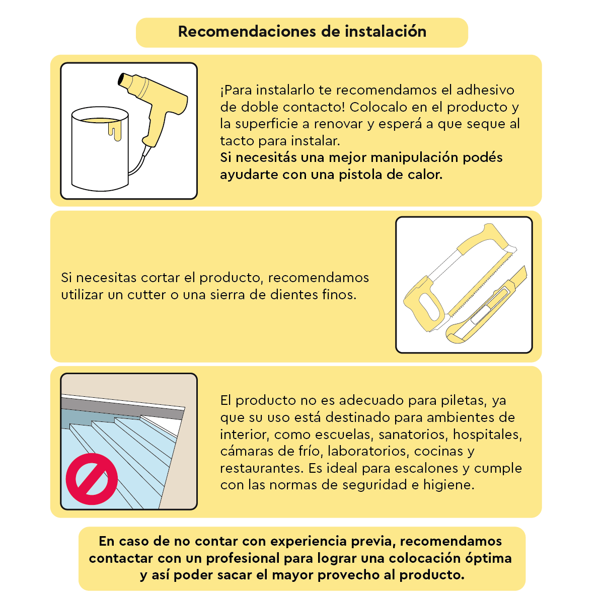 Diseñados para ambientes interiores de alto tránsito, su superficie antideslizante reduce drásticamente el riesgo de caídas. Fabricados en PVC resistente, son increíblemente flexibles y ligeros, facilitando una instalación sencilla con adhesivo de doble contacto (podés cortarlos con cúter o sierra de dientes finos y, si lo llegás a necesitar, moldearlos con una pistola de calor).
