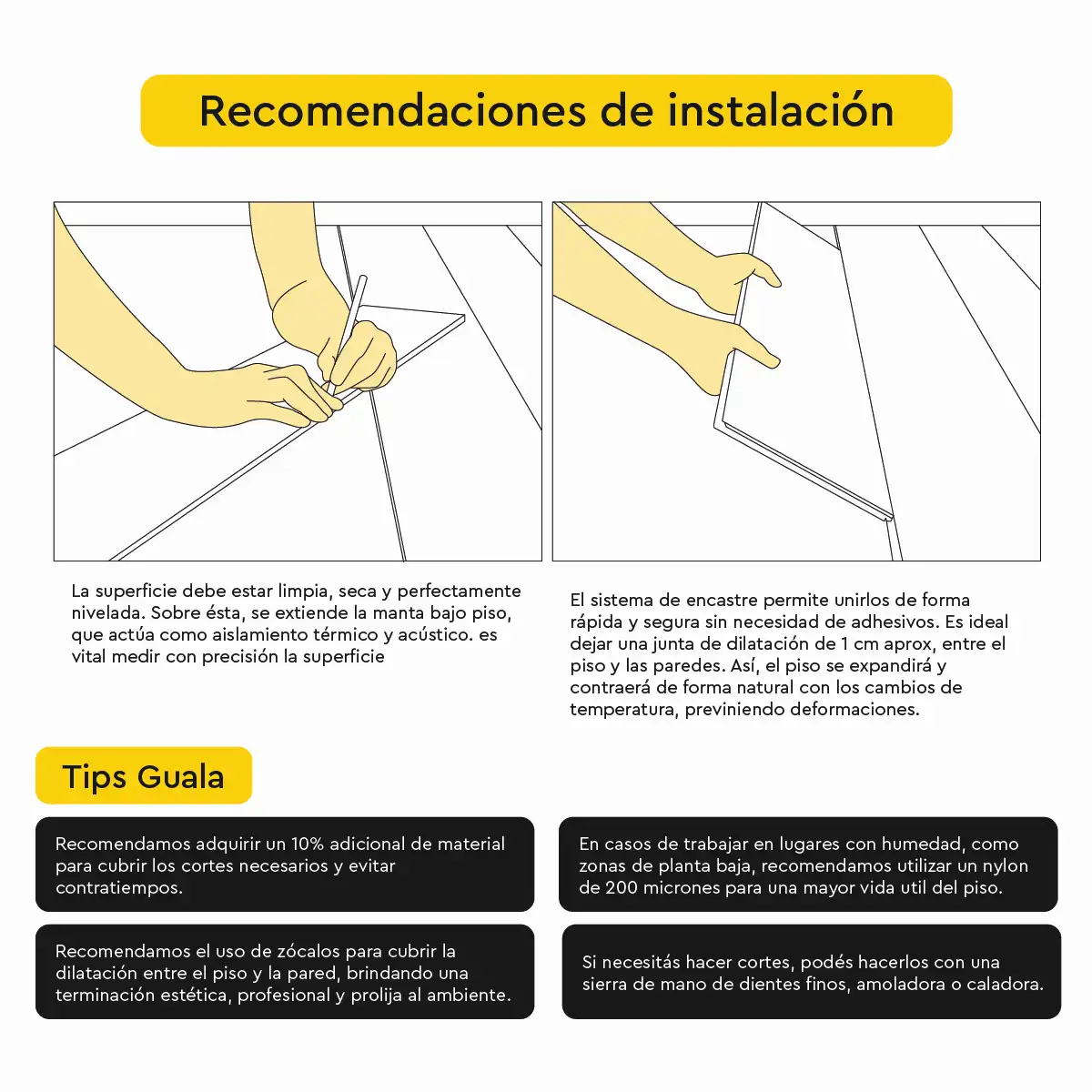 Piso flotante melaminico de alta resistencia con excelente acabado. Su sistema de encastre tipo click permite una instalación fácil y rápida.