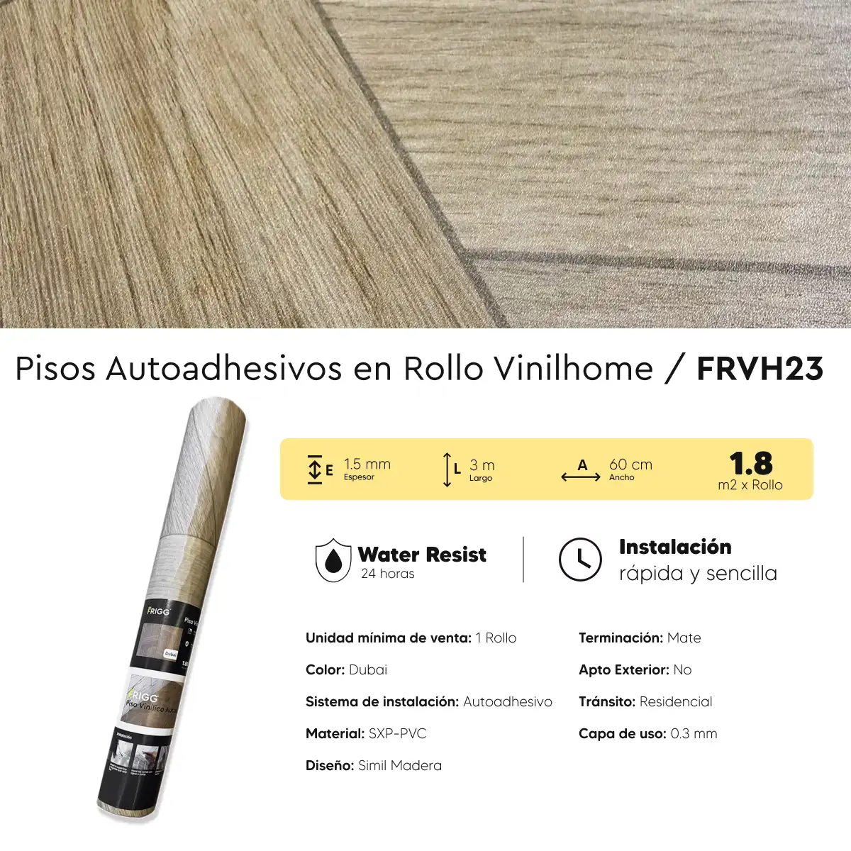 Piso Vinílico Autoadhesivo en Rollo Vinilhome Dubai 1.5 mm LVT Tránsito Residencial Frigg 1.8m²