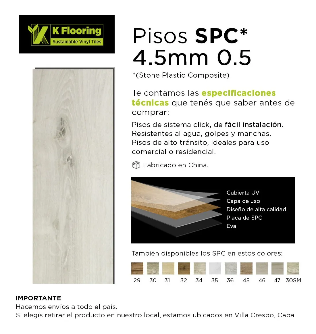 Piso vinílico Kflooring AquaS de SPC de tránsito comercial alto. Su sistema de encastre tipo click permite una instalación fácil y rápida. Resistente al agua.