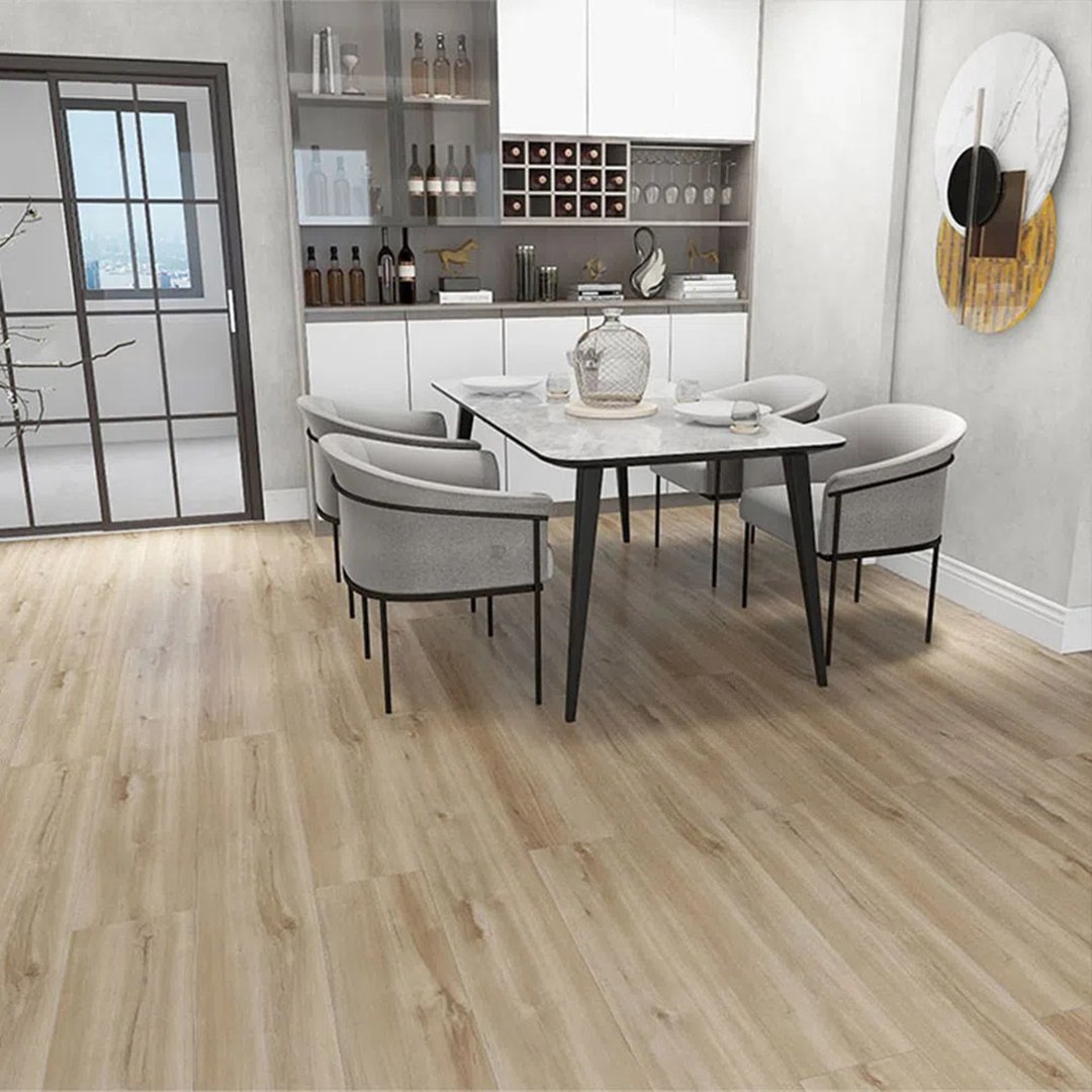 Piso vinílico Basis de SPC de tránsito comercial. Su sistema de encastre tipo click permite una instalación fácil y rápida. Resistente al agua.