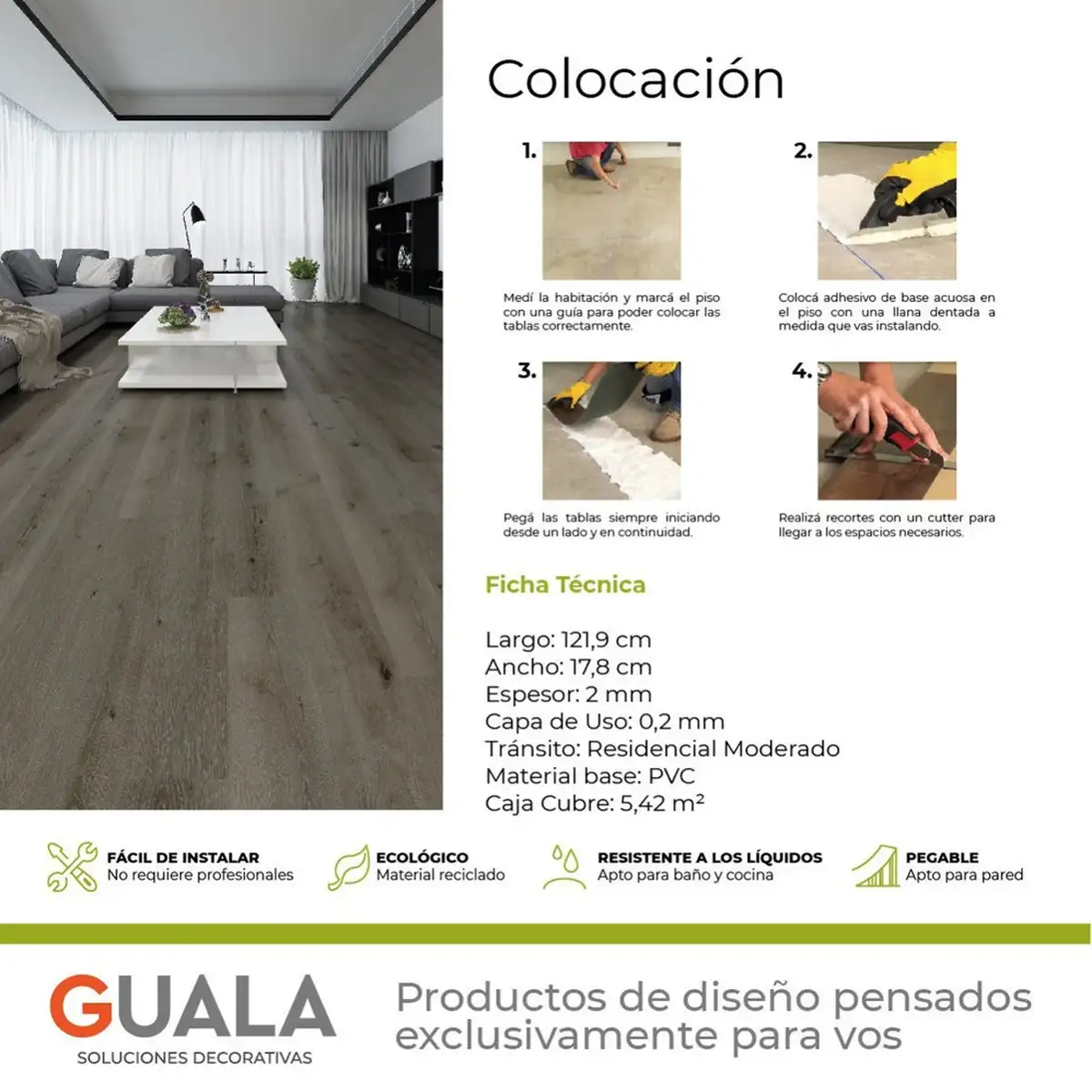 Es exclusivo de uso interior. Podés instalar el piso en livings, cocinas, dormitorios, locales comerciales, siempre recordá que es uso interior, no es recomendable instalar tampoco en lugares que estén al exterior bajo techo.