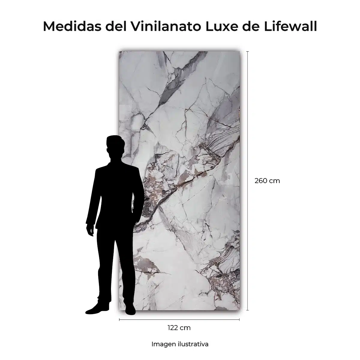 Transforma tus espacios con el Vinilanato Luxe de Lifewall. Este revestimiento de PVC de alta calidad, con un tamaño de 2.6m x 1.22m, ofrece un acabado brillante y realista que imita a la perfección el mármol. Su fácil instalación y bajo mantenimiento lo convierten en la elección perfecta para cualquier ambiente interior.