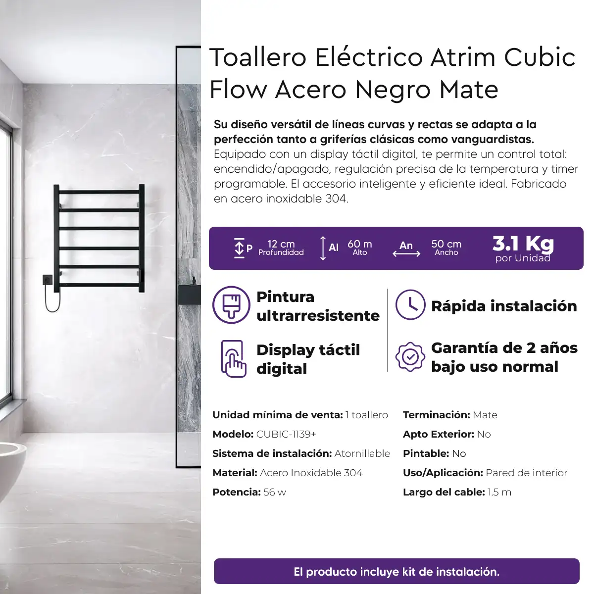 Toallero Eléctrico Atrim Flow Cubic 60×50 cm Negro Mate