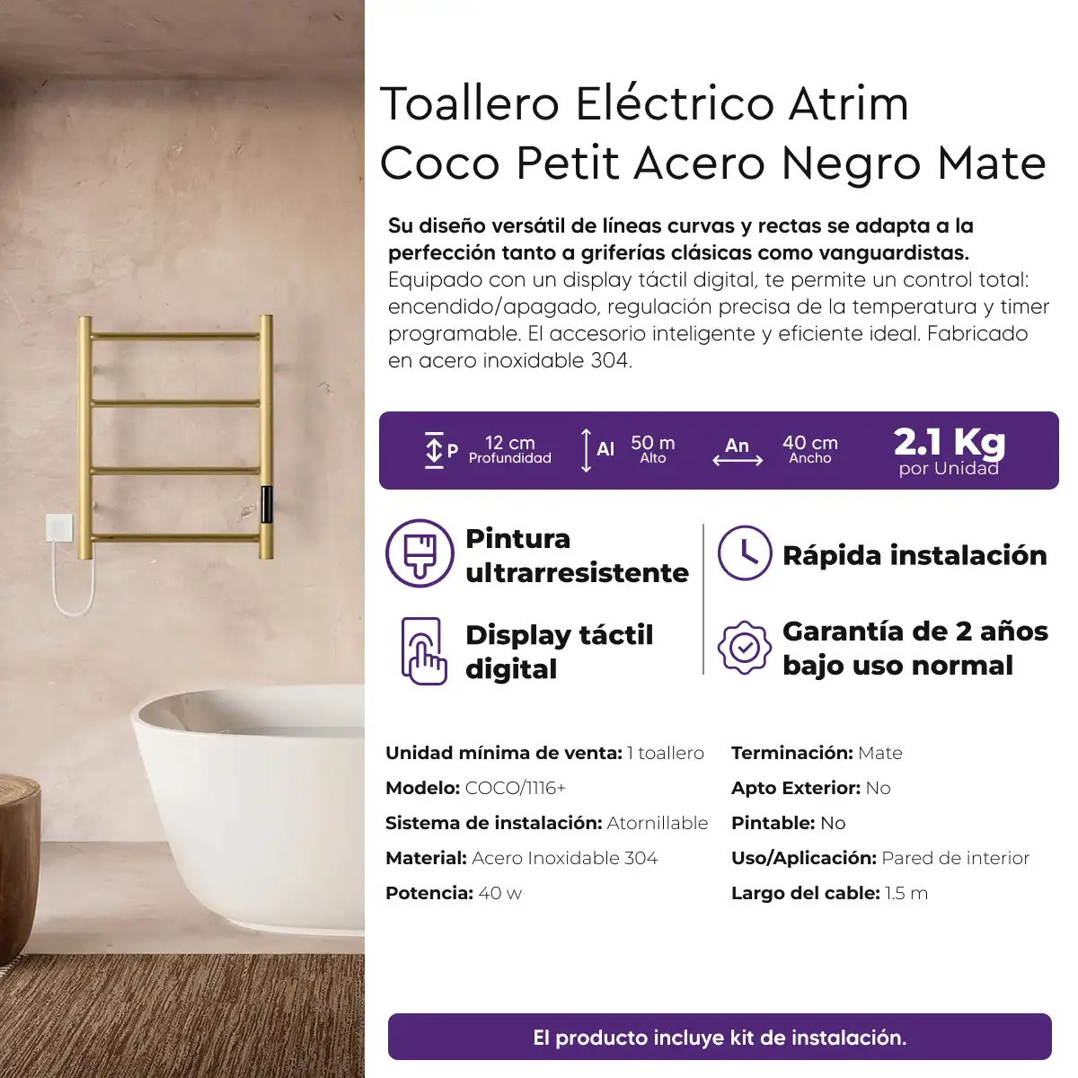 Toallero Eléctrico Atrim Petit Coco 50×40 cm Acero Negro Mate