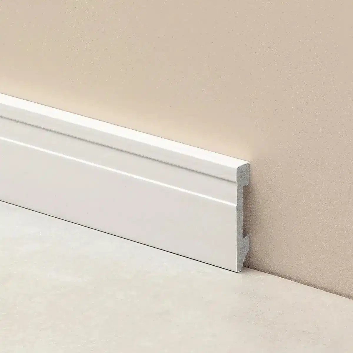 Zócalo Blanco Pintable de Epsilon de Atrim de 7 cm de altura, de diseño vanguardista cuenta con una línea bajo relieve como detalle decorativo. Variedad de colores en tendencia.