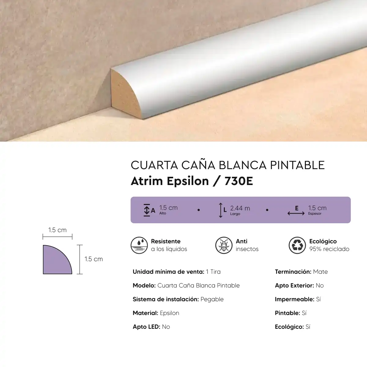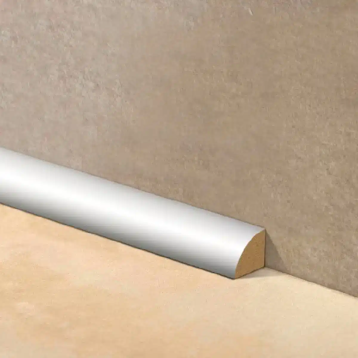 Zócalo Cuarta Caña Blanca Pintable de Epsilon de Atrim de 1.5 cm de altura, de diseño minimalista, ideal para personalizar y proteger el ángulo formado entre piso y pared, evitando que esa unión quede expuesta a la fricción.