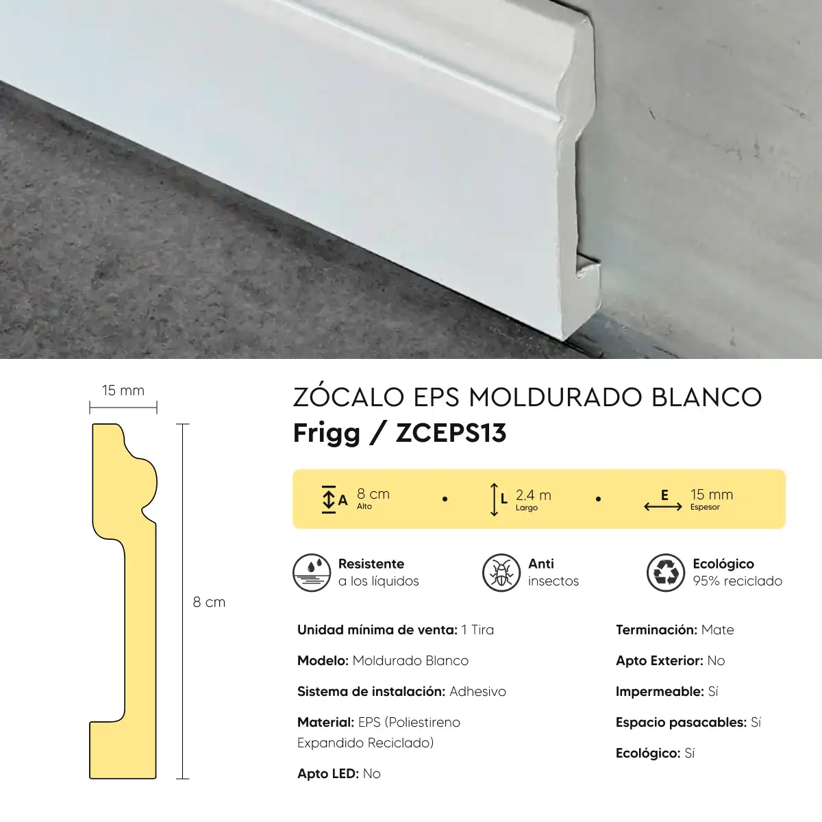 Zócalo Frigg Moldurado Blanco EPS Antihumedad 8 cm