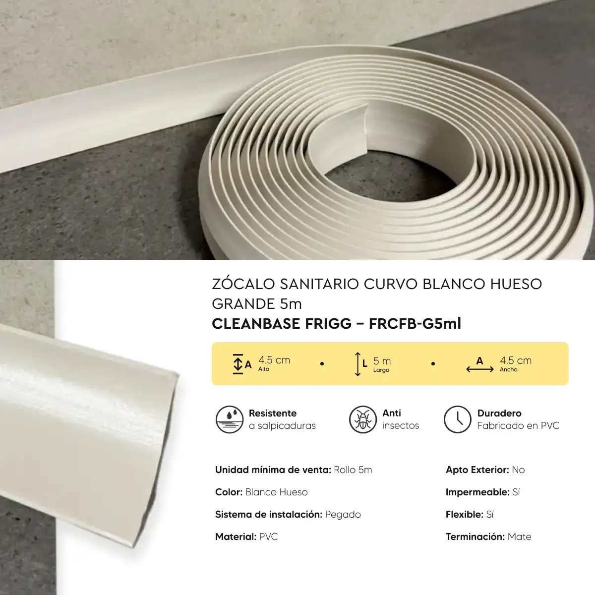 Zócalo Sanitario Curvo Blanco Hueso Grande CleanBase Frigg 4.5 cm 30m